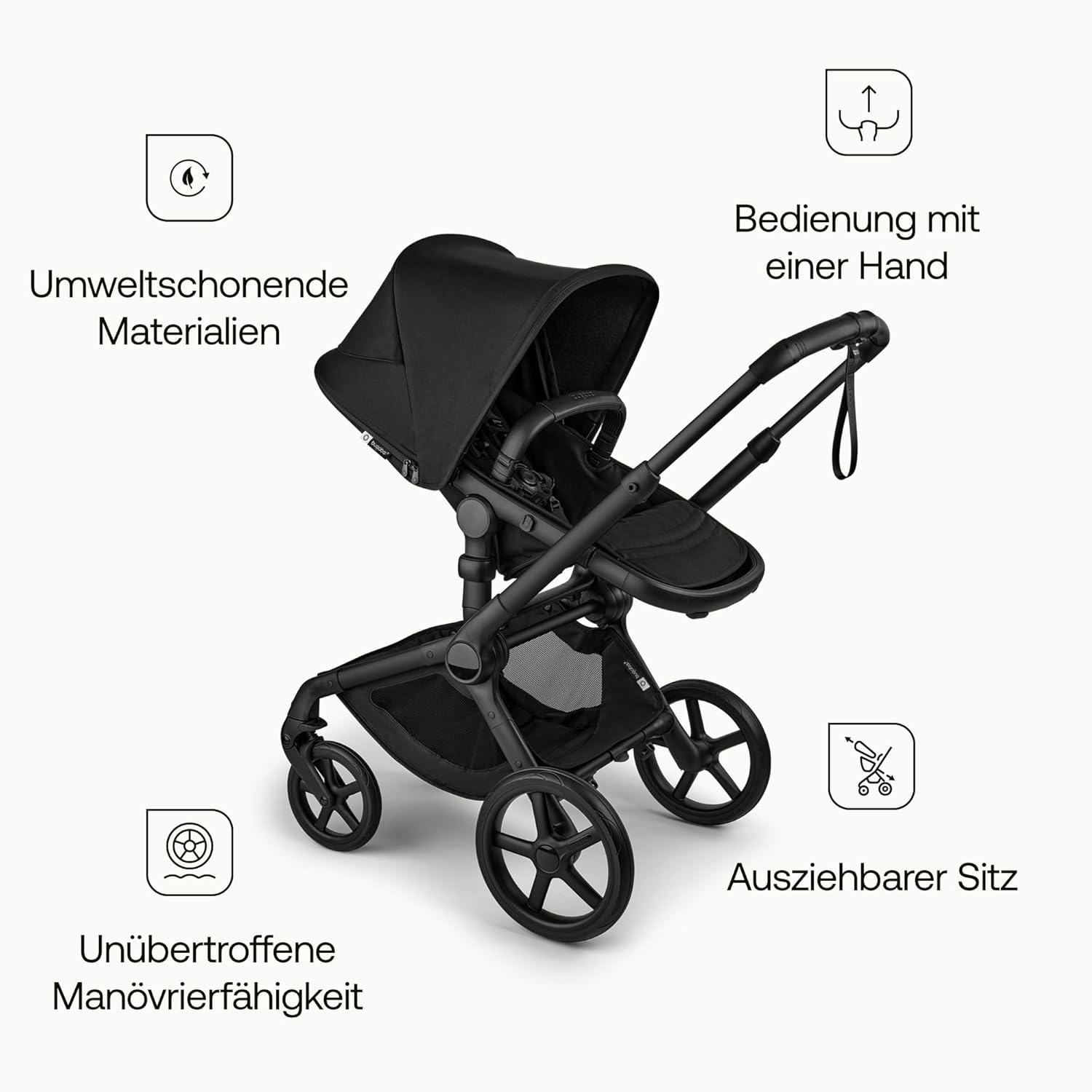 Achte auf höhenverstellbaren Schieber (wichtig bei 1,55 m vs. 1,90 m), leichte Lenkung und Balance beim Bordsteinheben. Ein guter Bugaboo liegt ausgewogen in der Hand und kippt nicht nach hinten, wenn die Wickeltasche voll ist.